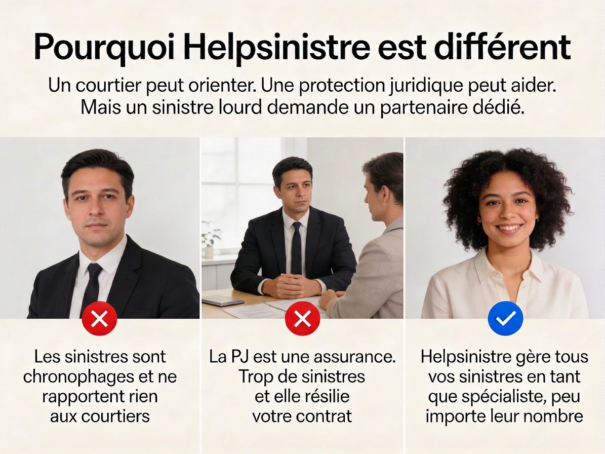 Un courtier ou un conseiller sont parfois un bon premier soutien, tout comme une assurance de. protection juridique. Mais lorsqu’un sinistre est complexe, lourd, chronophage ou litigieux, ce dont un particulier ou une PME ont besoin, c’est d’un partenaire dont la mission est claire: analyser, structurer, suivre, relancer, défendre et ne pas lâcher le dossier tant qu’il n’est pas résolu.